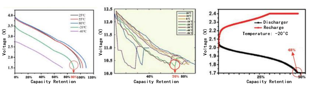 Krzywe rozładowania akumulatorów sodowo-jonowych (po lewej), akumulatorów LFP (w środku) i akumulatorów kwasowo-ołowiowych (po prawej) w różnych temperaturach